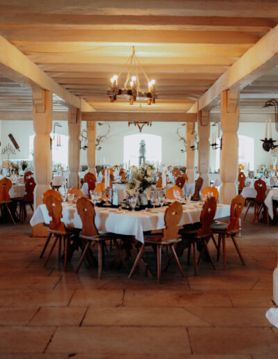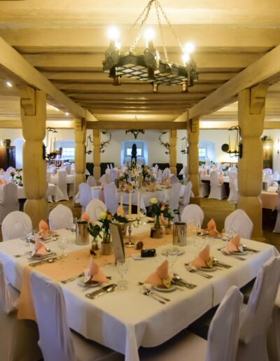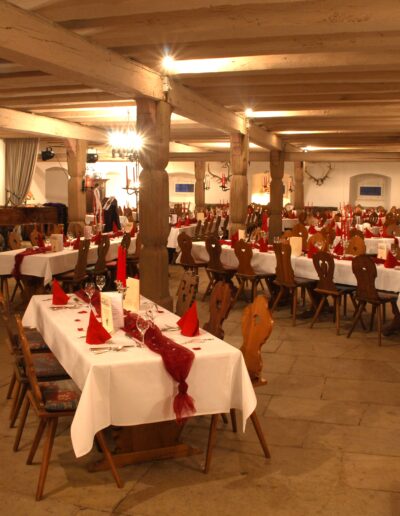 Der rustikale Rittersaal (ca. 300qm) ist für max. 180 Personen ausgelegt und kann bei Bedarf abgeteilt werden. Als besonders empfehlenswerte Bestuhlung z.B. für Hochzeiten hat sich eine Gruppierung mit bis zu 12 Tischwürfeln je 10 Personen erwiesen.