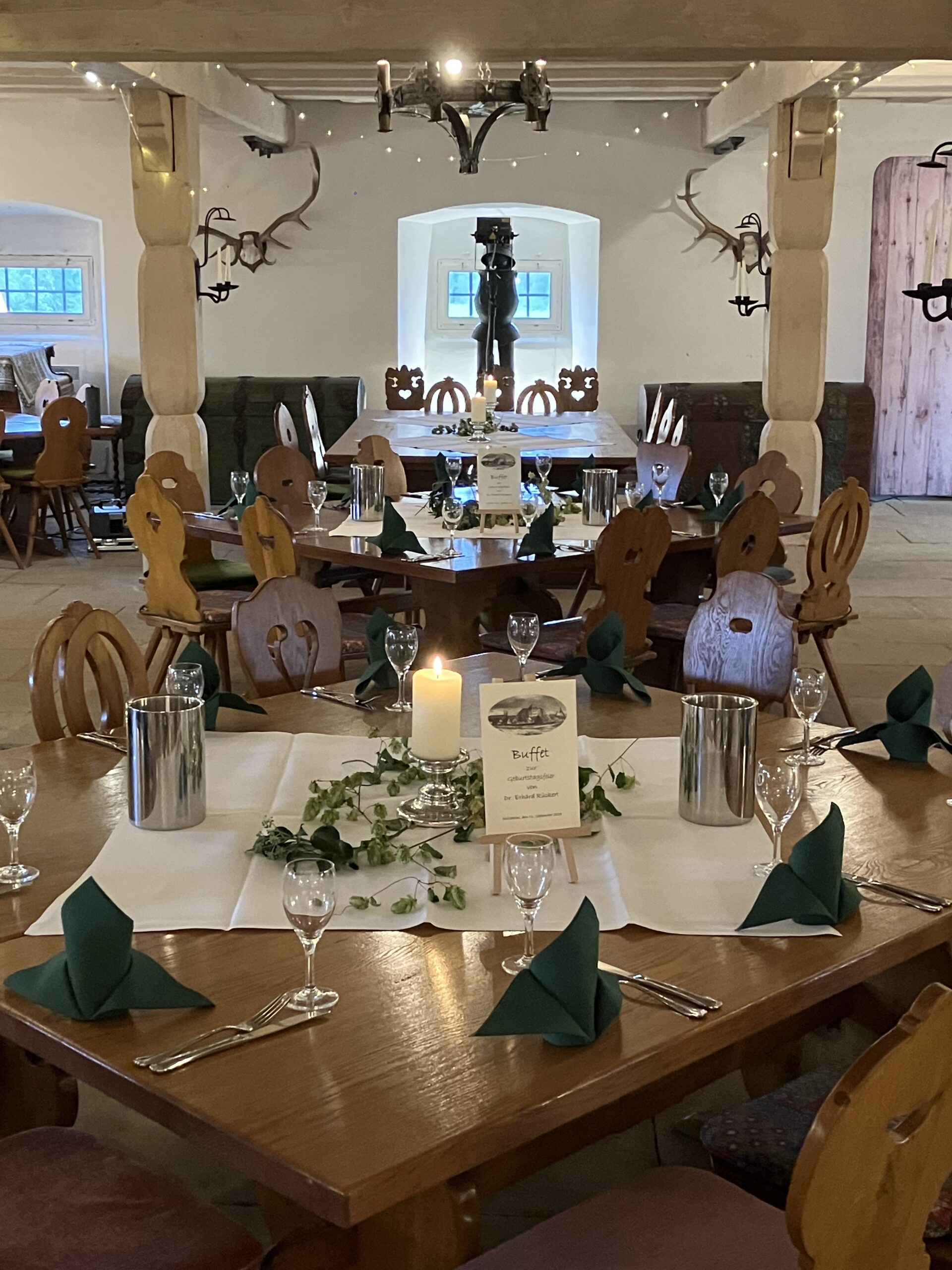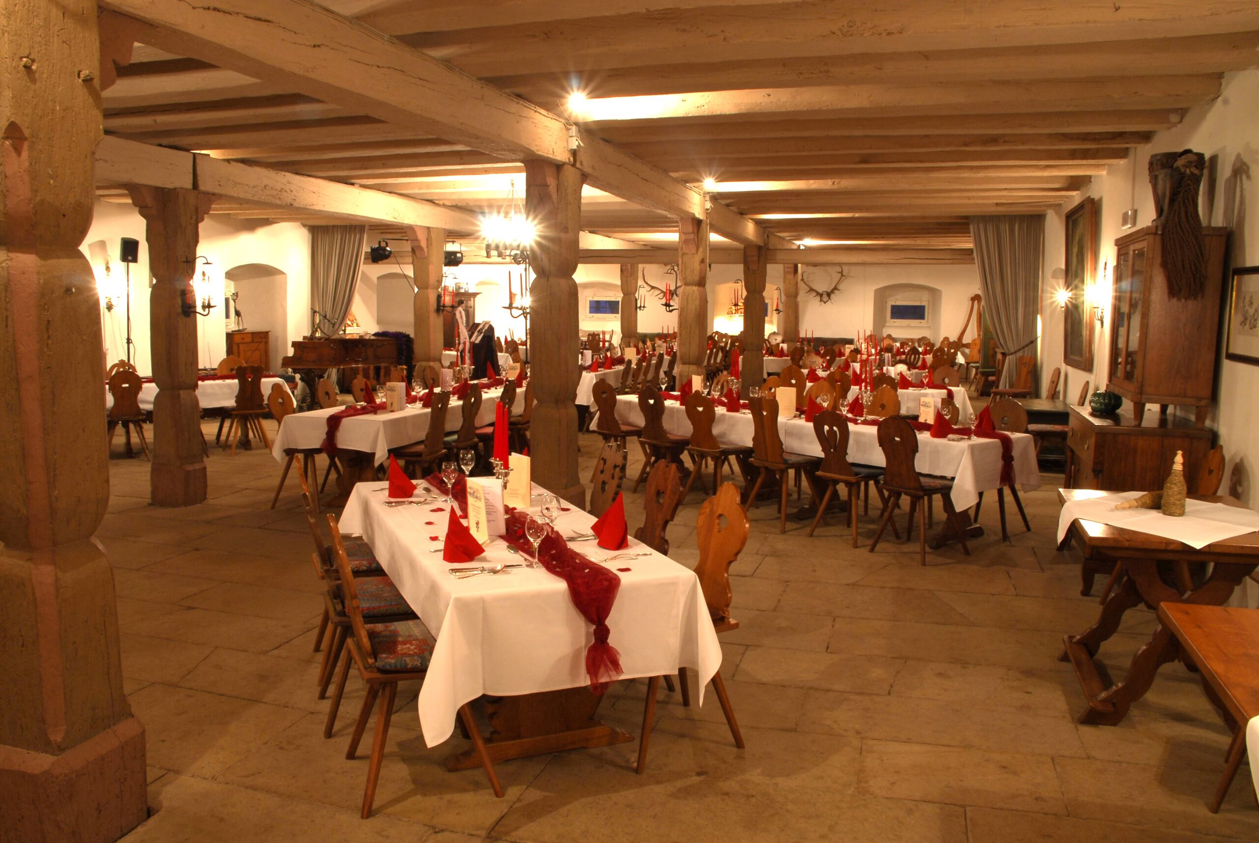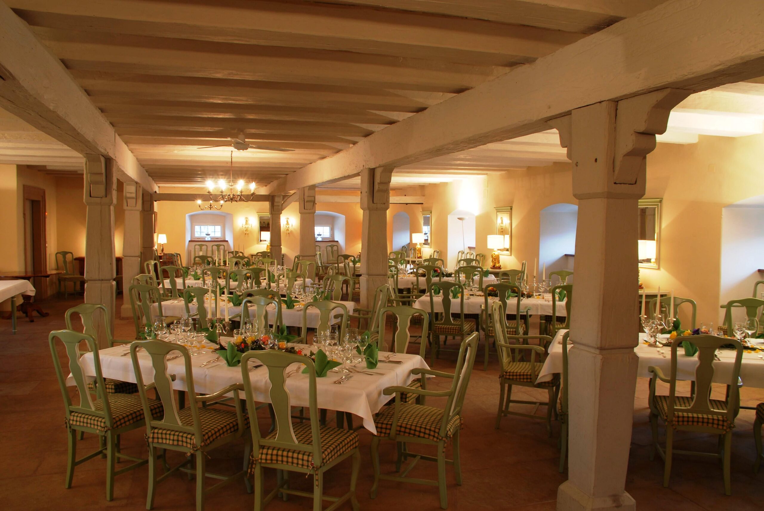 Der rustikale Rittersaal (ca. 300qm) ist für max. 180 Personen ausgelegt und kann bei Bedarf abgeteilt werden. Als besonders empfehlenswerte Bestuhlung z.B. für Hochzeiten hat sich eine Gruppierung mit bis zu 12 Tischwürfeln je 10 Personen erwiesen.