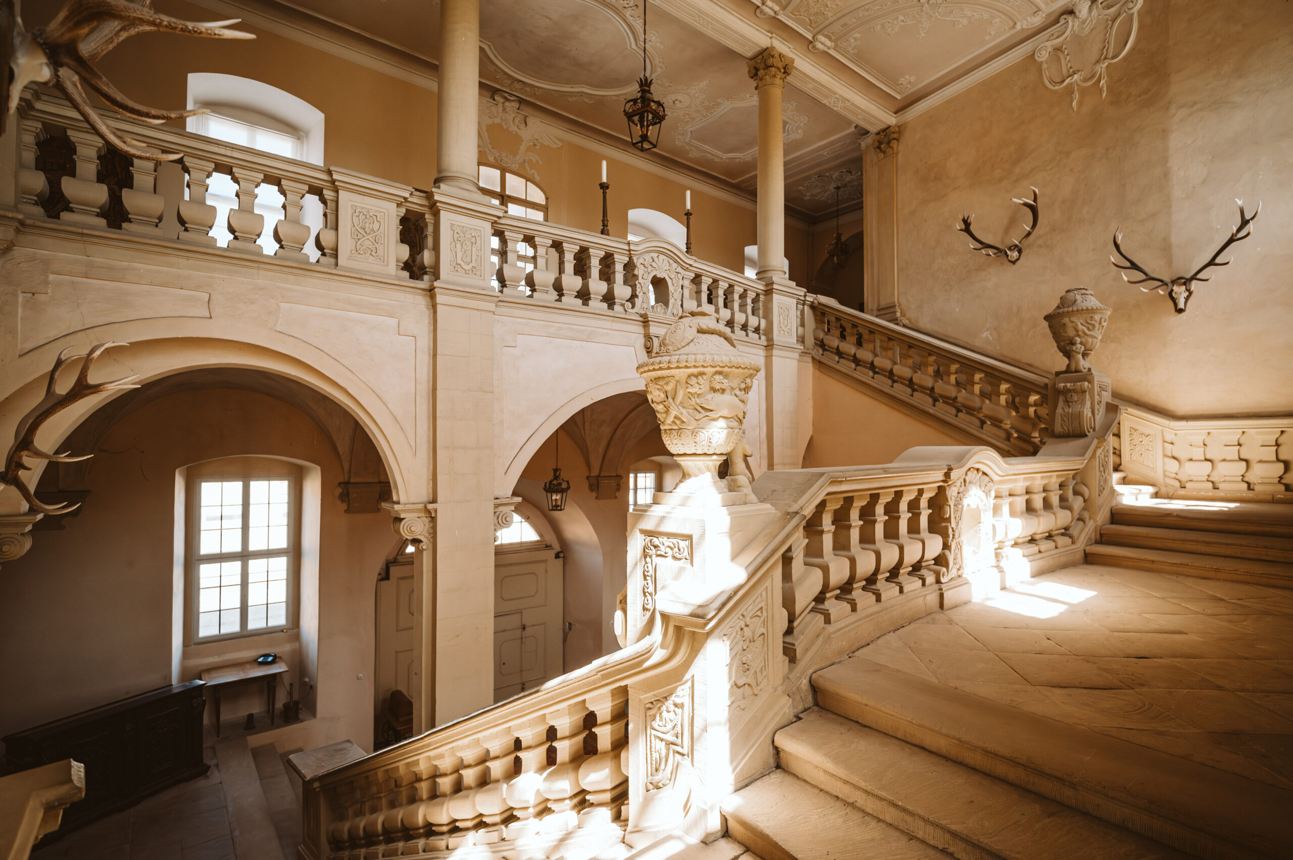 Das große Treppenhaus ist der ideale Ort für einen Sektempfang, z.B. im Anschluss an die standesamtliche Trauung und bietet zudem attraktive Möglichkeiten für Fotoshootings.