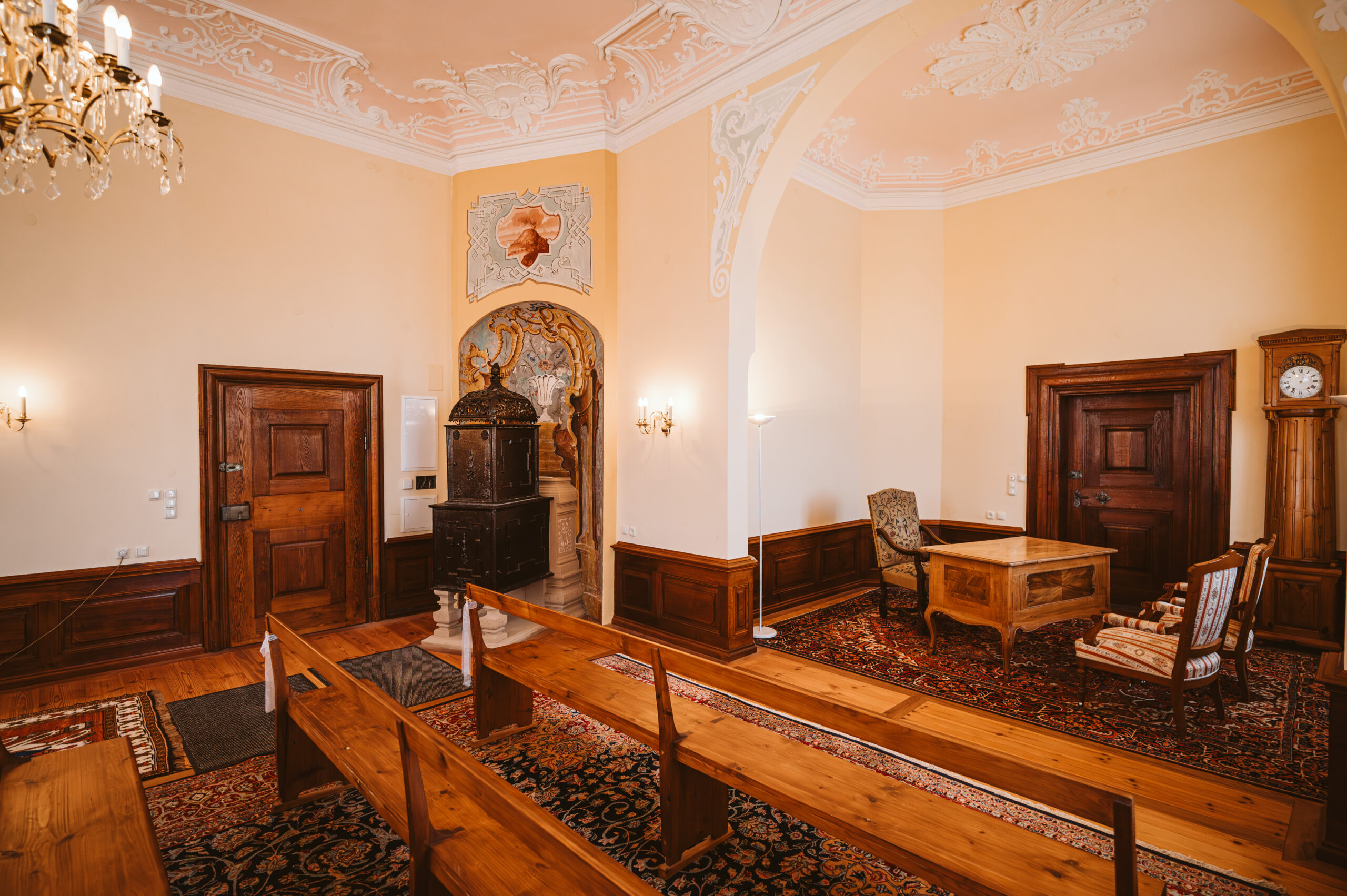 Als zusätzliches Highlight wird ab 2026 unsere ehemalige und frisch restaurierte Hauskapelle als multifunktionaler Eventraum zur Verfügung stehen. Sie ist für max. 100 Personen (stehend) und 65 Personen bestuhlt geeignet. Sie kann für Trauungen, Empfänge, Präsentationen oder Tagungen gebucht werden.
